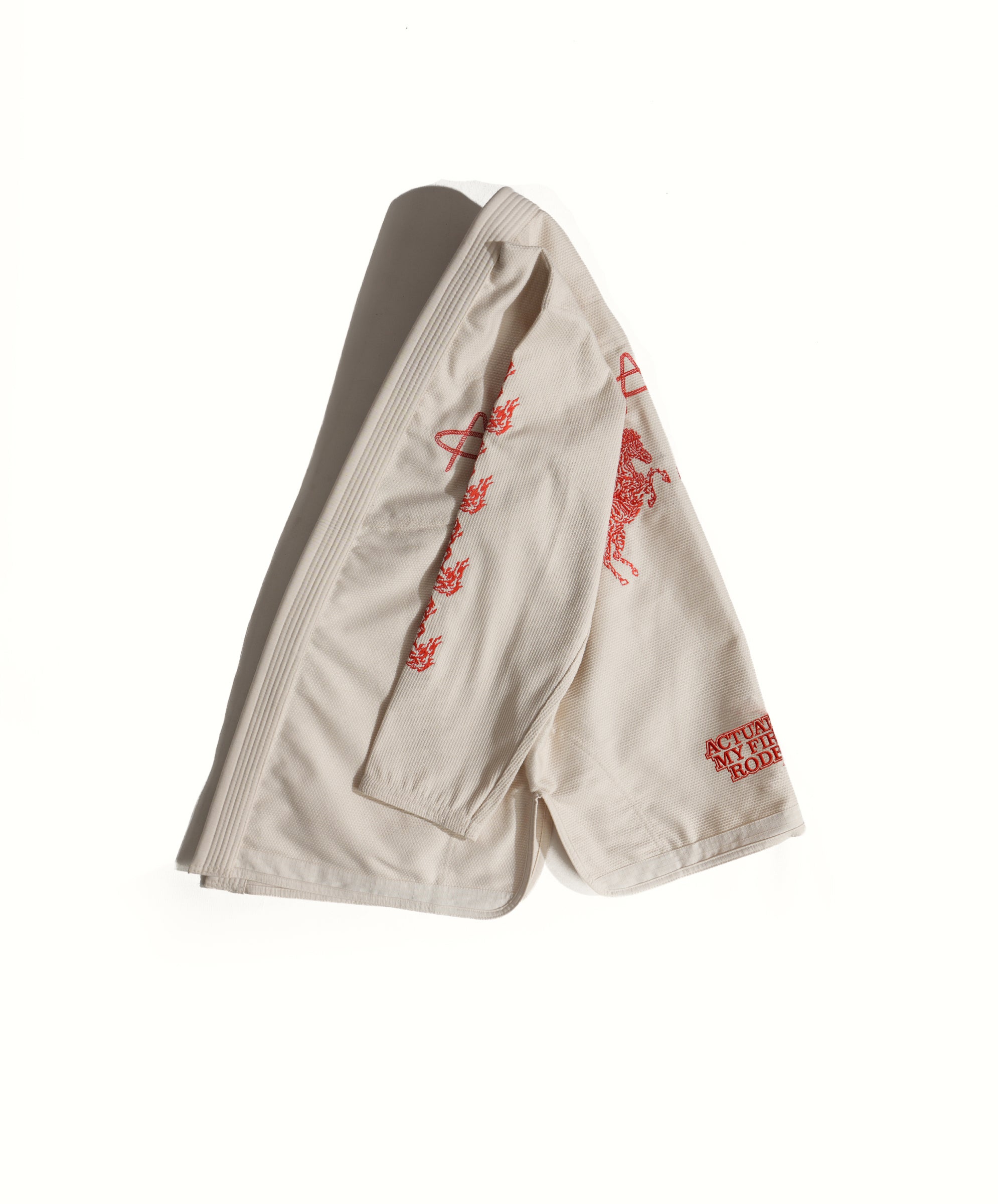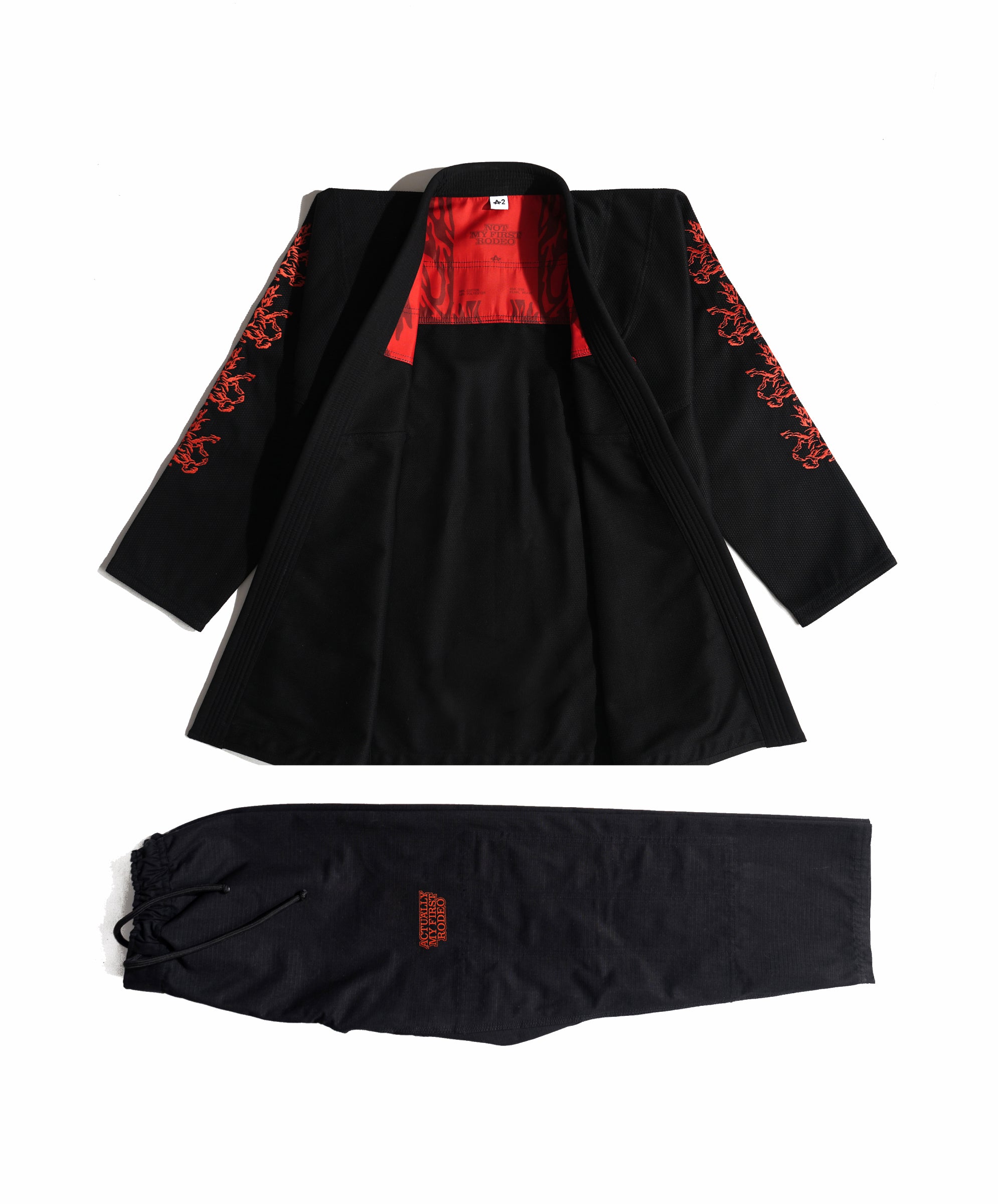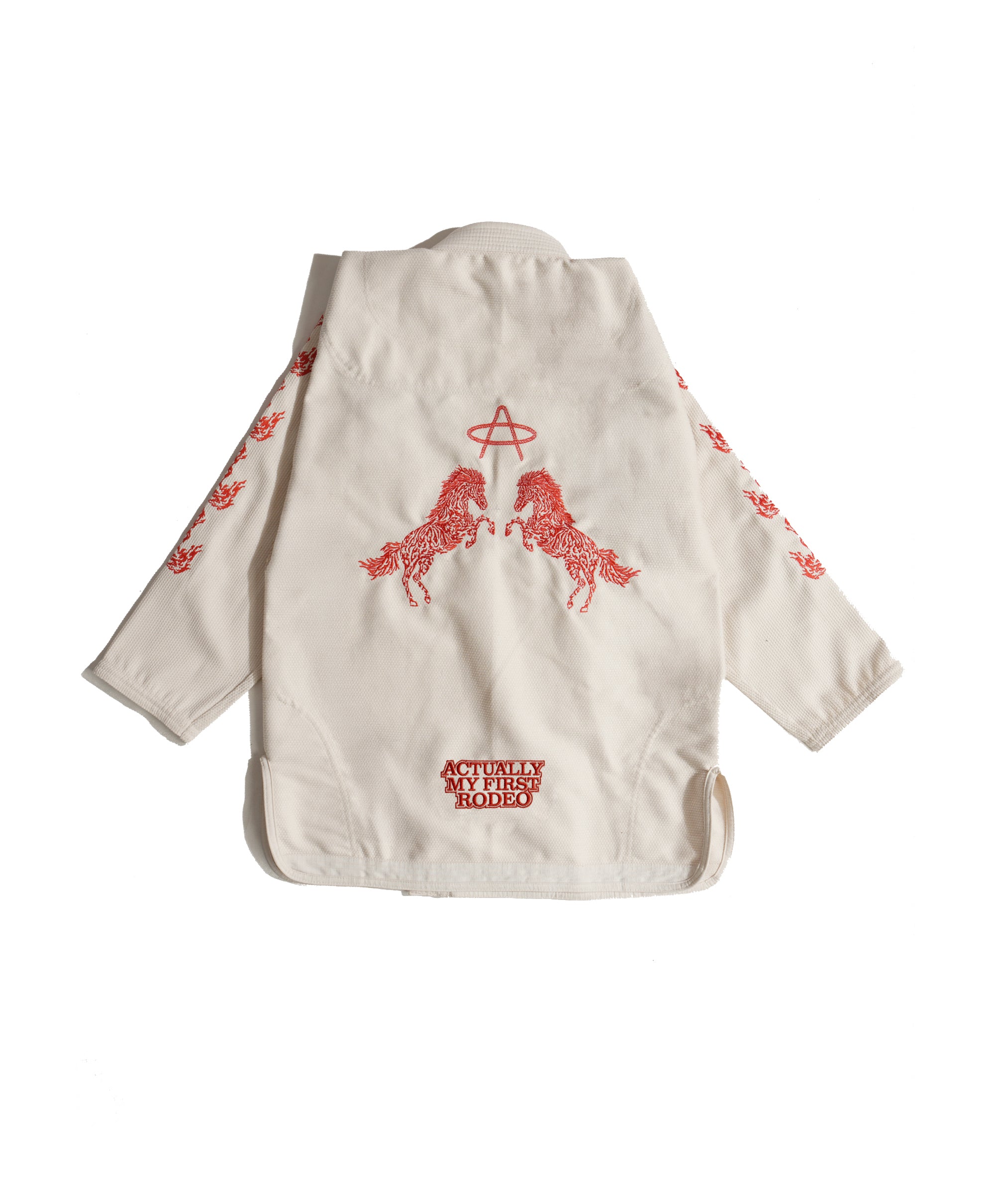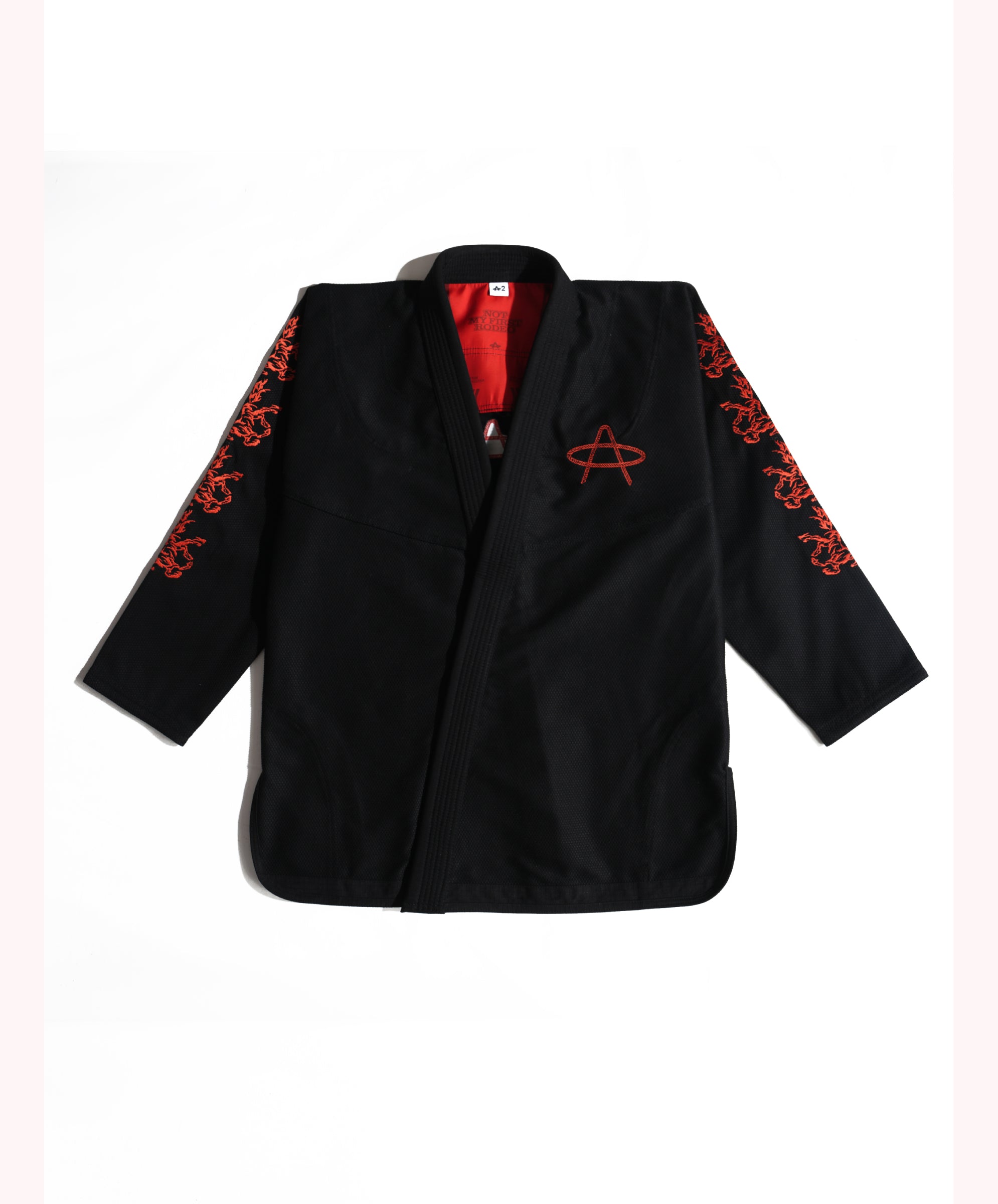 Lasso All Around "A" on the chest. Horses up both sleeves. Same raised rope-stitch detail as its big sibling, the black "Not My First Rodeo" gi. Same 450 GSM pearl weave. Same red satin lining that whispers from the collar while someone's got you in a cross-face you don't know the name of yet.
