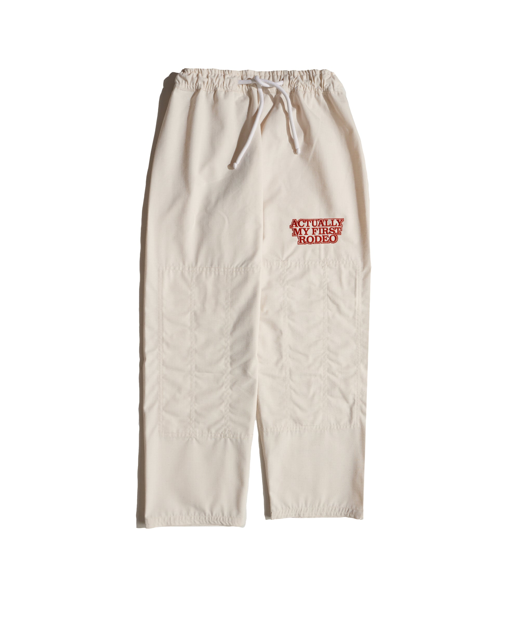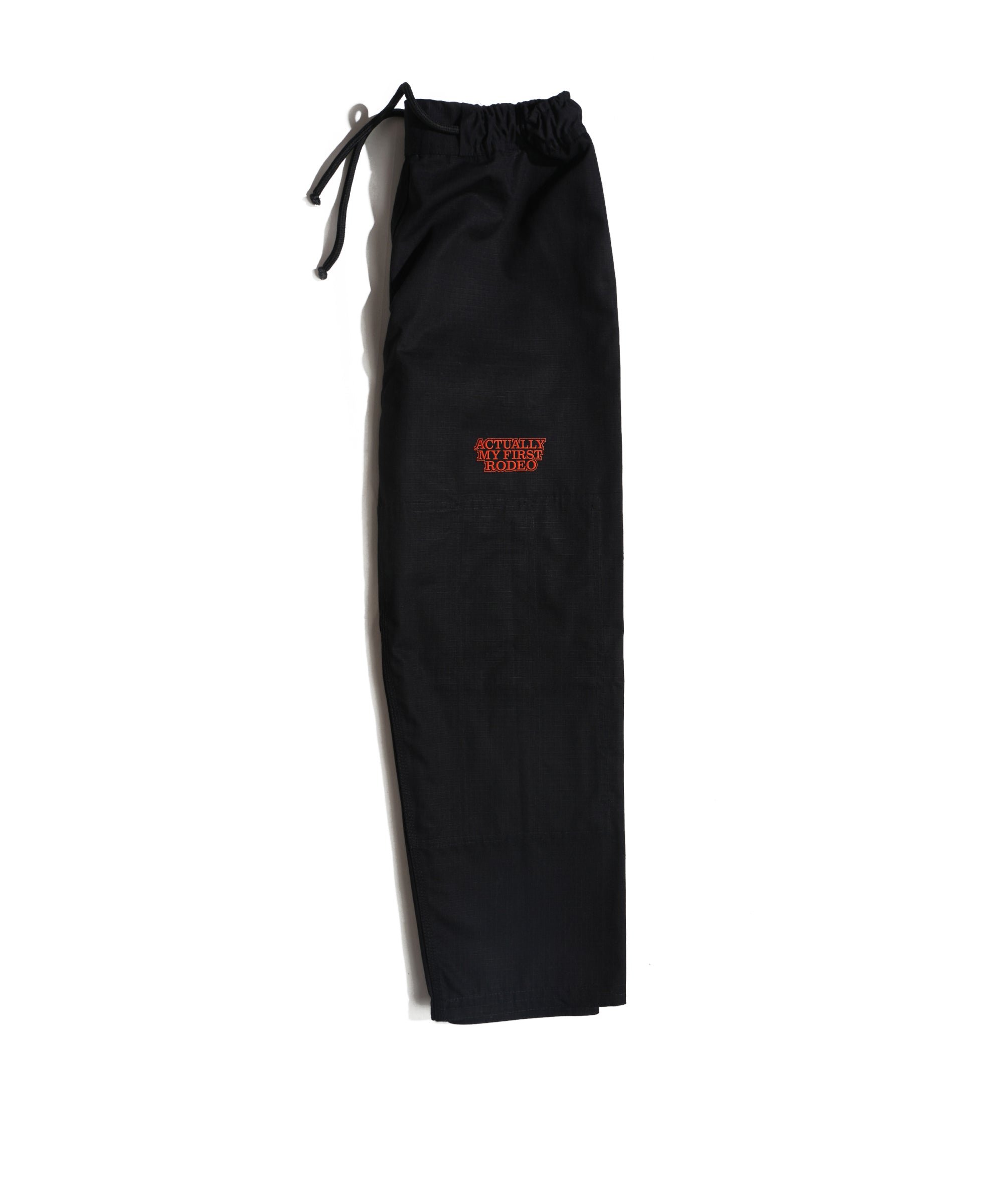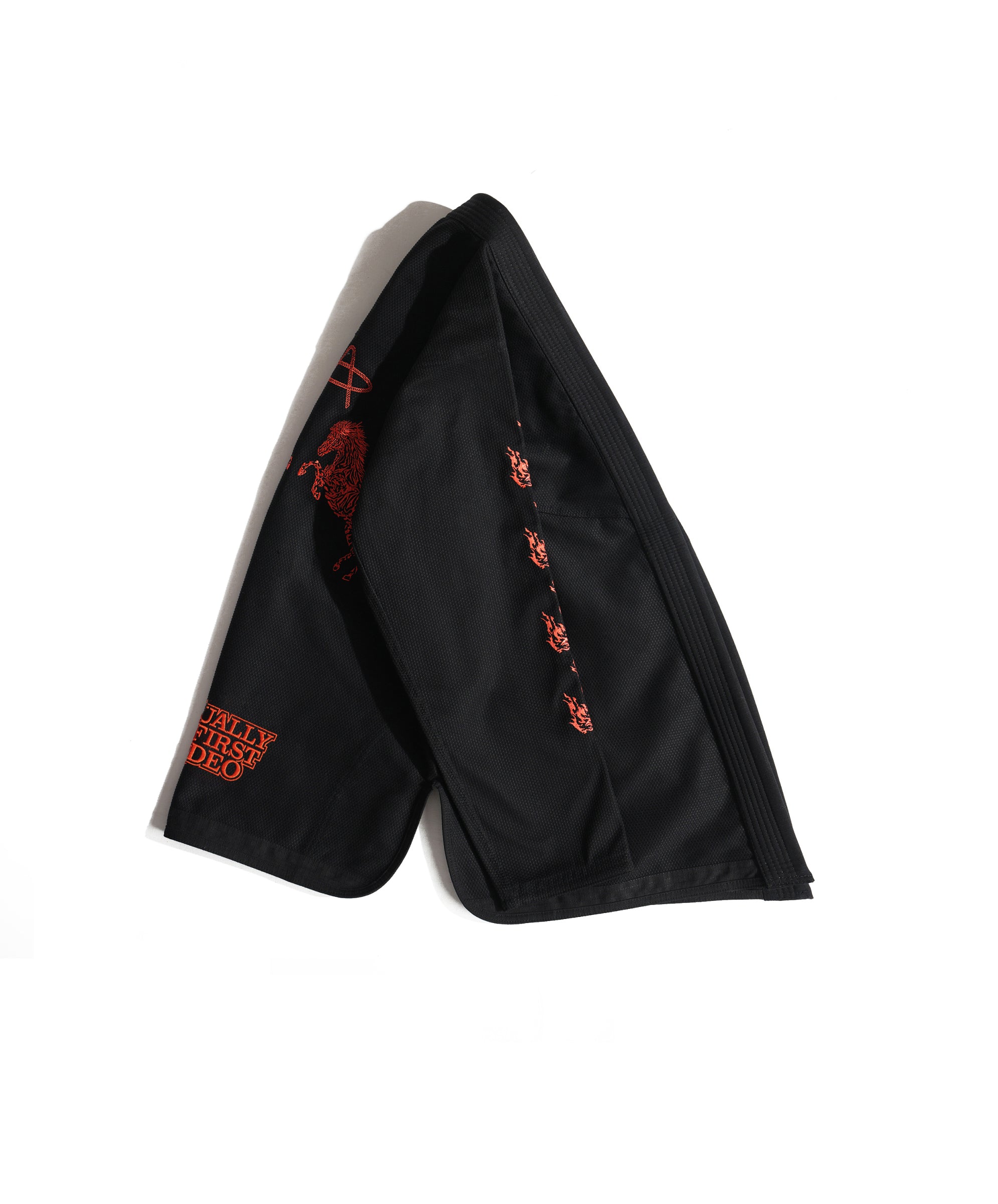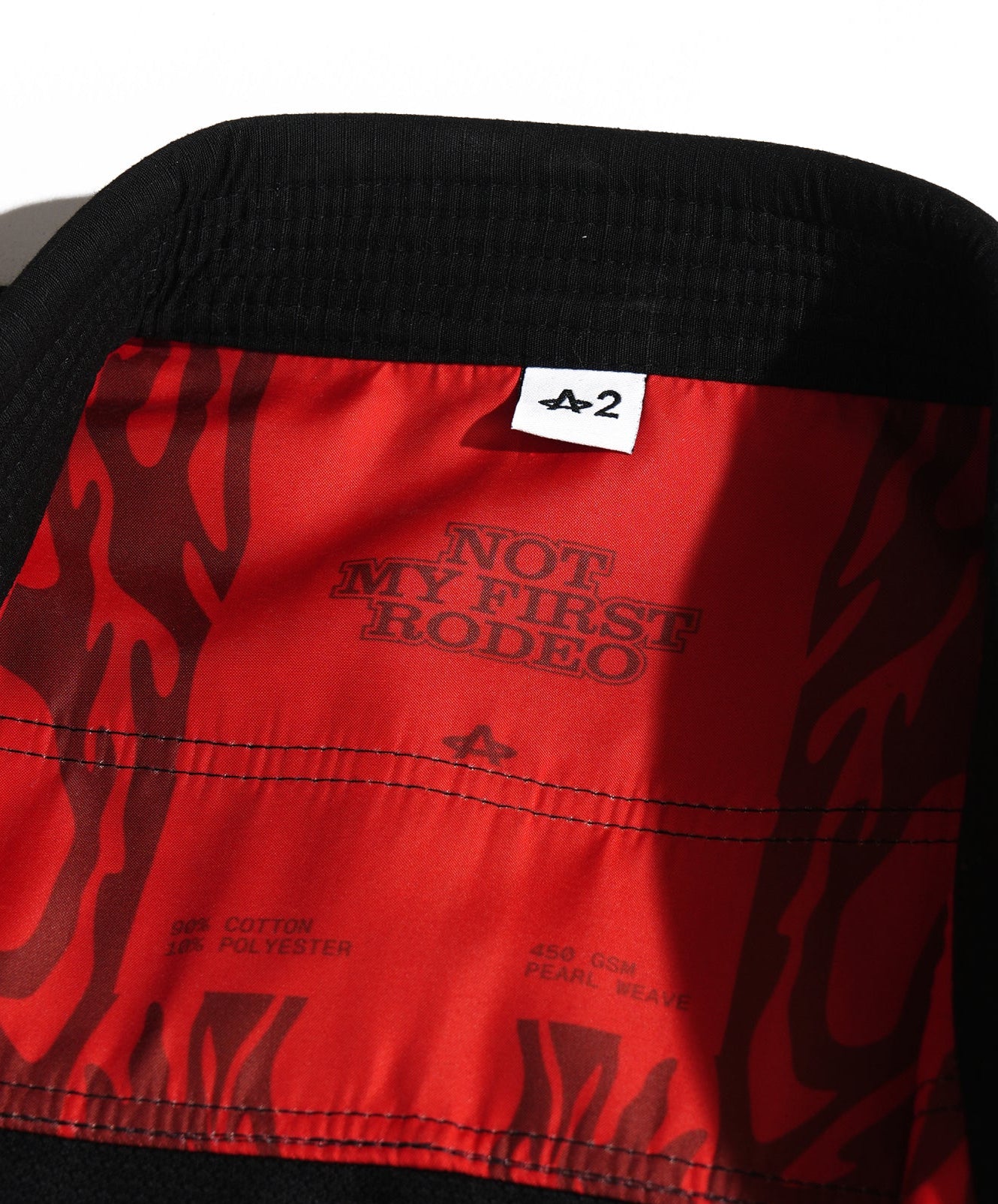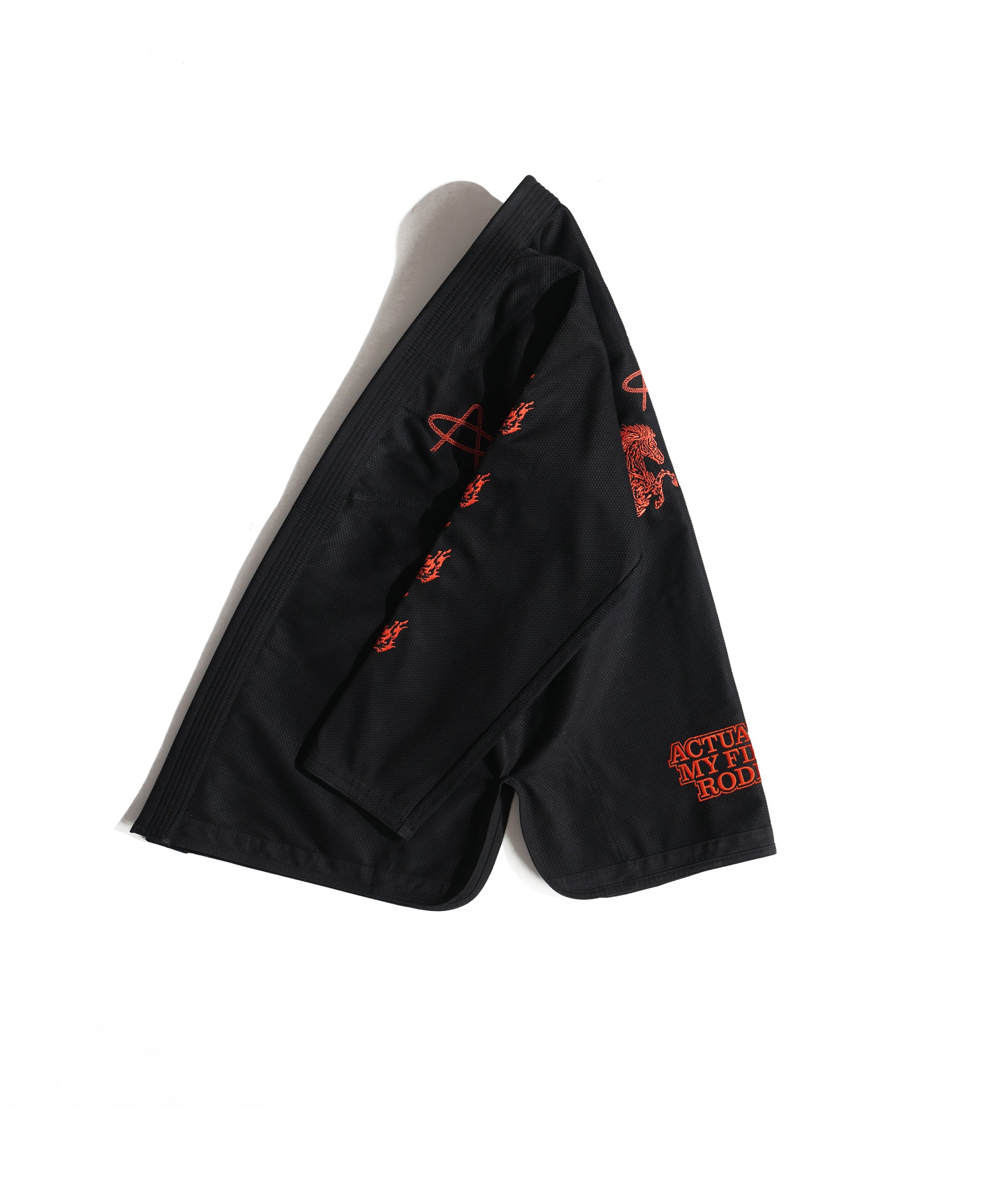 Lasso All Around "A" on the chest. Horses up both sleeves. Same raised rope-stitch detail as its big sibling, the black "Not My First Rodeo" gi. Same 450 GSM pearl weave. Same red satin lining that whispers from the collar while someone's got you in a cross-face you don't know the name of yet.