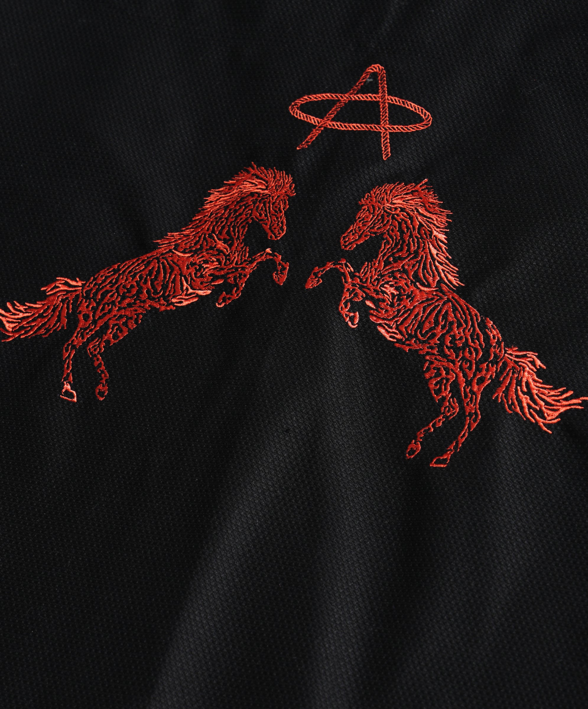 Orange rope-texture embroidery. Two rearing horses face each other across the back — no rider, no cowboy, just raw energy waiting for a direction. That's you right now. All potential, zero apology.